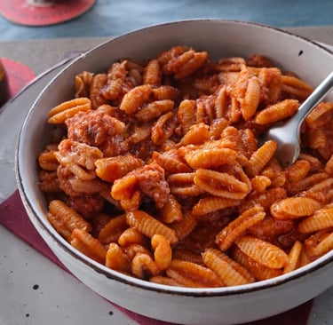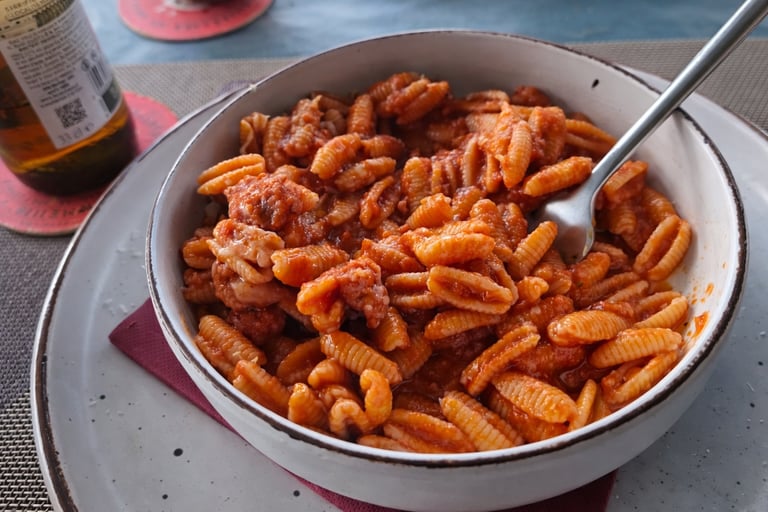 Pasta típica sarda con salsa de tomate, salchicha fresca y queso pecorino