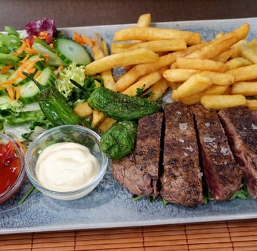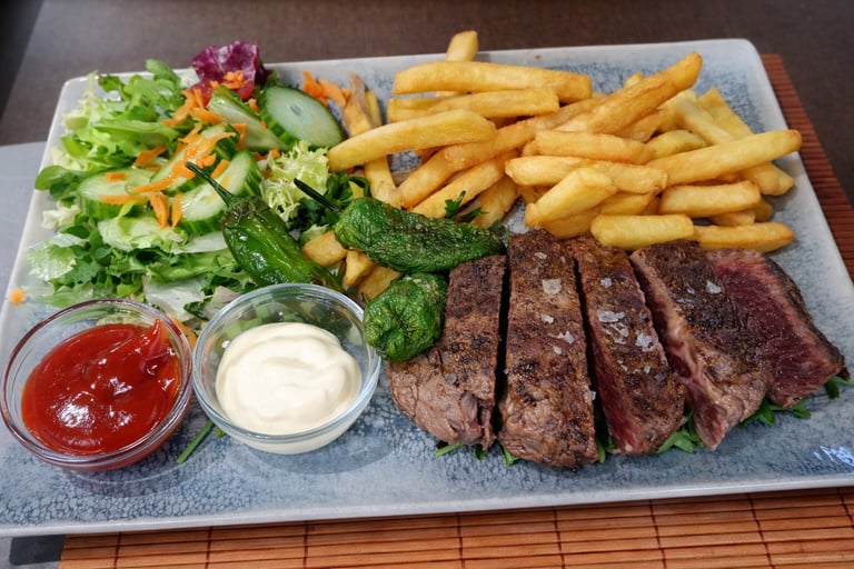 42. Entrecot con patatas y ensalada — 18,00 € (300 g) / 25,00 € (500 g)